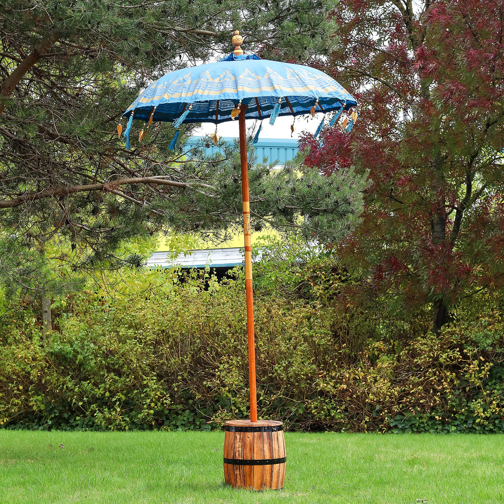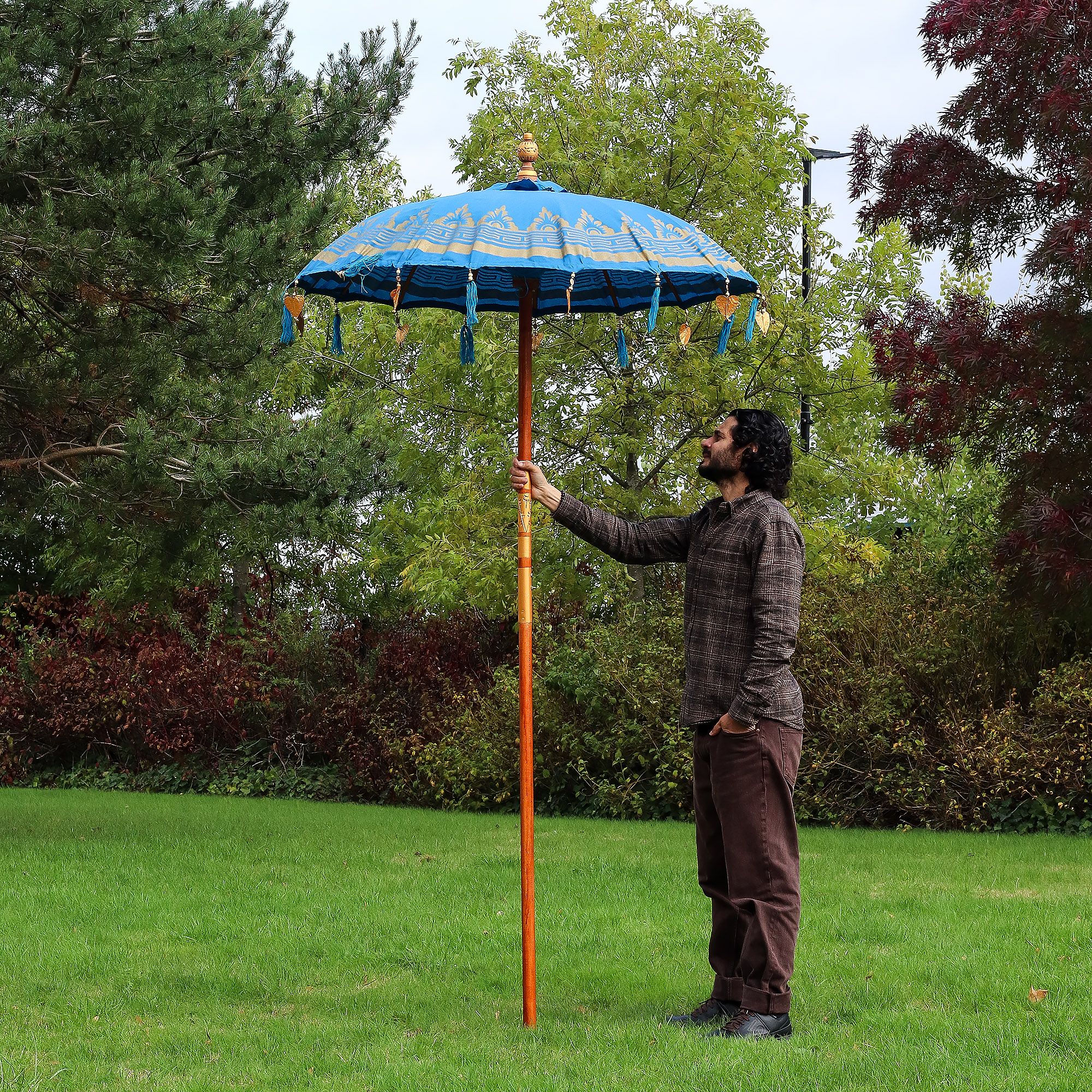 Bring a touch of Bali’s charm to your garden with this handmade turquoise patio parasol. The rich colour contrasts beautifully with the gold motifs and tassels, creating an elegant focal point for outdoor spaces.